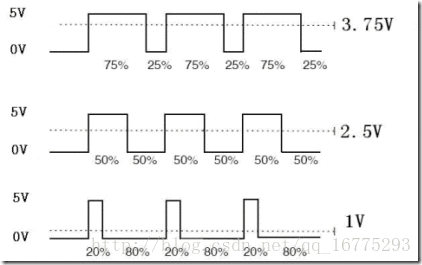 通俗一点讲那,就是当如果我们想输出5V电压时,只需一直输出高电平即可;当我们想输出3.75V电压时,那我们就需要在一个周期内(一个高电平和一个低电平为一个周期)3.75÷5=75%时间输出高电平,25%时间输出低电平;同理,如果想输出2.5V电压时,我们需要在一个周期内50%时间输出高电平,50%时间输出低电平。