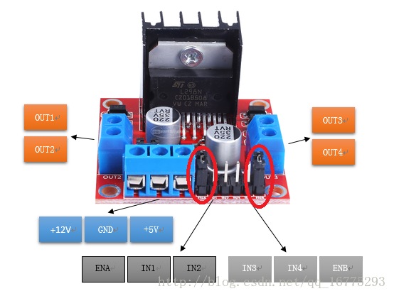 在前面的教程中已经讲过如果想控制驱动的输出时,需要对驱动的“ENA”“ENB”进行控制,因此我们需要将图中被选中部分的两个跳线帽拔掉。并将“ENA”连接Arduino UNO开发板的“5”引脚,“ENB”连接“6”引脚。